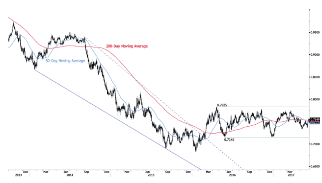 长线看,我们等待当前下跌趋势结束的更多迹象。关键支撑位于0.6009 (2008年10月31日低点)。需要突破关键阻力 0.8295 (2015年1月15日高点)才能令我们取消长线看空观点。