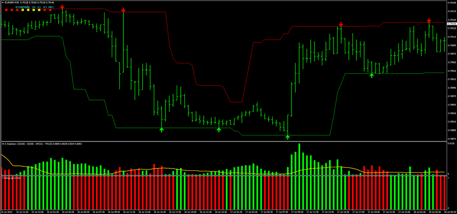 止损应设在箭头上方/下方10点处。止盈根据货币对及时间周期调整。