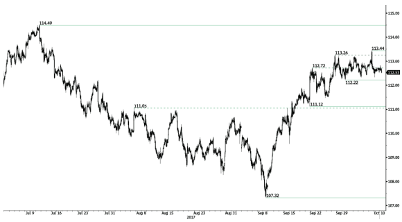 美元兑日元(USDJPY)持稳 美元兑日元(USDJPY)今日技术分析 美元兑日元未能保持在前阻力位113.26 (2017年9月27日低点)上方。支撑位于111.99(2017年10月10日低点)。不过,短线可能很快将出现一定的获利了结,目前下行风险不断上升。 我们倾向于长期看空,支撑目前位于99.02 (2013年8··· 作者: 返佣啦 2017-10-13 10:46 2,356