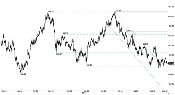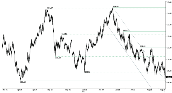 美元兑日元(USDJPY)109.00附近波动性下降 美元兑日元(USDJPY)今日技术分析 美元兑日元自支撑位强劲反弹。该汇价可能将重新试探前支撑位108.13(2017年4月17日低点)。预计将展开新一波下跌走势。 我们倾向于长期看空,支撑目前位于96.57 (2013年8月10日低点)。逐步涨向主要阻力135.15(2002年2月1日高··· 作者: 返佣啦 2017-08-29 10:32 1,367