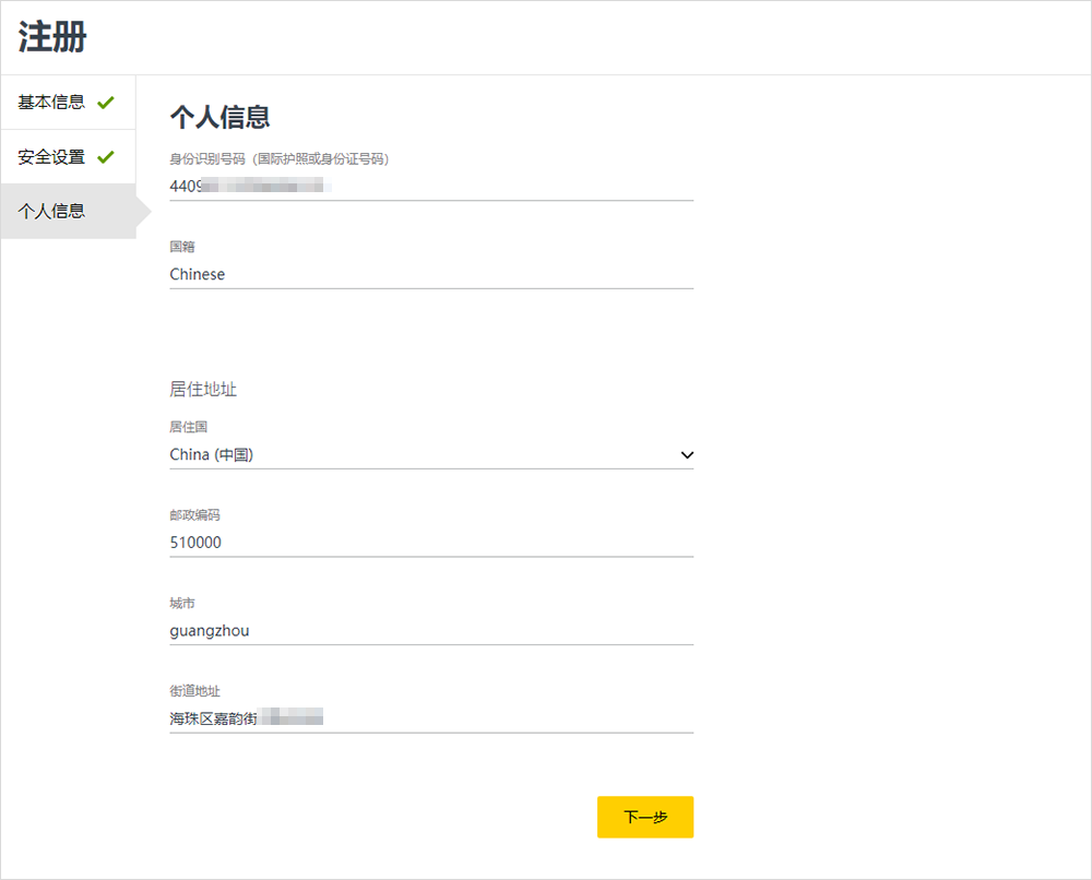 输入身份证号码,地址请用中文填写并确保和身份证上的地址完全一致