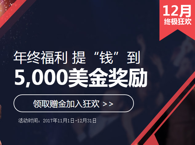 凡活动期间净入金1,000美金及以上的客户,均可获得10%赠金奖励,奖金最高可达5,000美金;活动时间:2017.11.01 - 2017.12.31 -